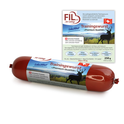 Trainingswurst 99% Wildfleisch aus Schweizer Tierhaltung mit Galacum und Käse. Eine aussergewöhnliche Trainingswurst, leicht verdaulich und bekömmlich. Ein Leckerbissen für jeden Liebling. Hergestellt in der Schweiz mit Schweizer Rohstoffen.
