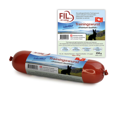 Trainingswurst 99% Kaninchen aus Schweizer Tierhaltung mit Galacum und Käse. Eine aussergewöhnliche Trainingswurst, leicht verdaulich und bekömmlich. Ein Leckerbissen für jeden Liebling. Hergestellt in der Schweiz mit Schweizer Rohstoffen.